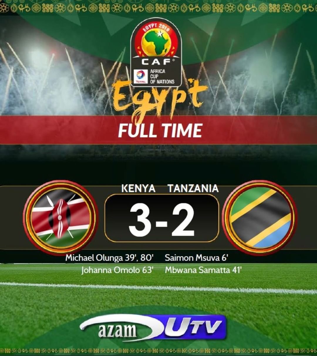 Game Stratistics. FT: Kenya 3-2 Tanzania. Admin All, News June 28, 2019 1 Minute Game Stratistics. FT: Kenya 3-2 Tanzania. Share this: Share on X (Opens in new window) X Share on Facebook (Opens in new window) Facebook Like Loading... Related Published by Admin View all posts by Admin Published June 28, 2019