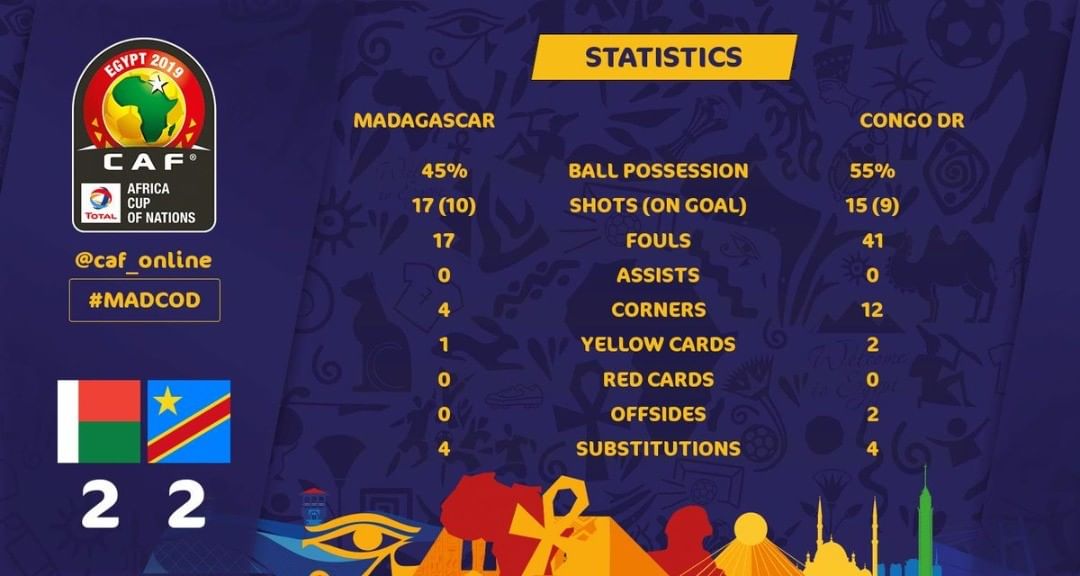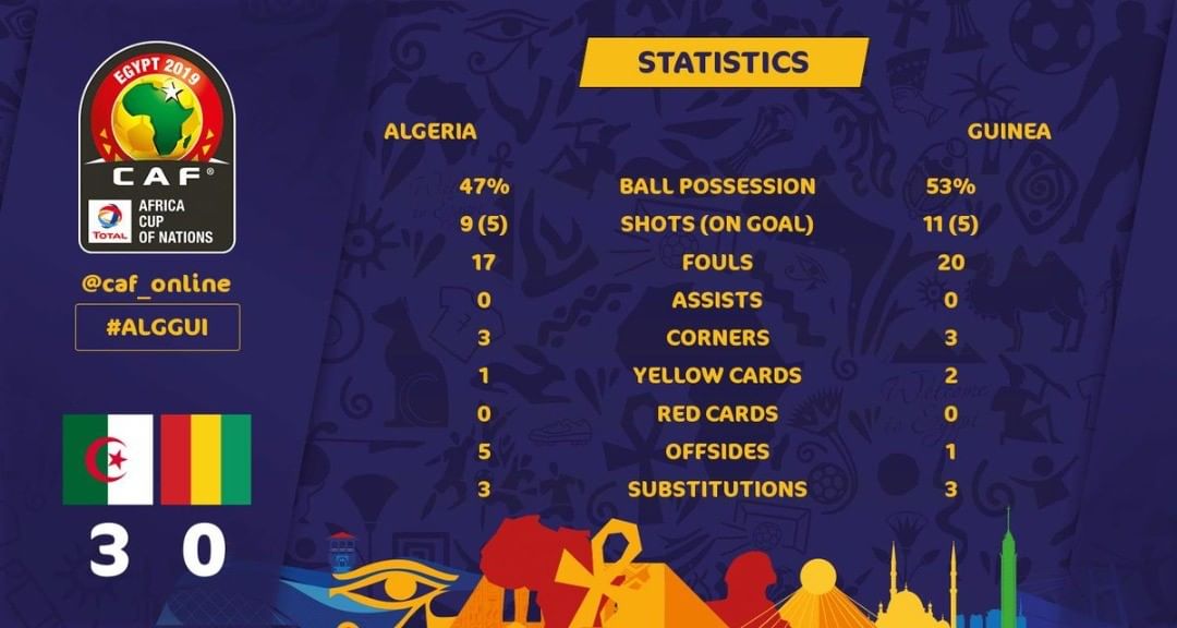 STATS | Check out the full-time stats! Which team had the better overall performance? #TotalAFCON2019 #ALGGUI pic.twitter.com/rjdjwMuUE2— CAF (@CAF_Online) July 7, 2019